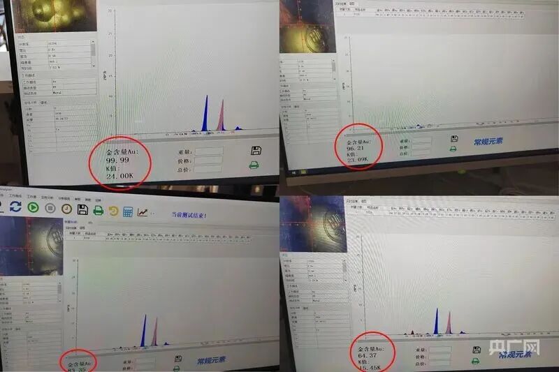 因对饰品含金量产生怀疑,李女士前往清远市清城区某从事黄金回收业务的门店检测,结果发现不同点位的金含量数据存在差异。